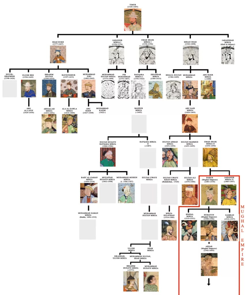 This lineage shows the direct continuation of Timur’s bloodline from Central Asia to India, where it flourished for centuries.